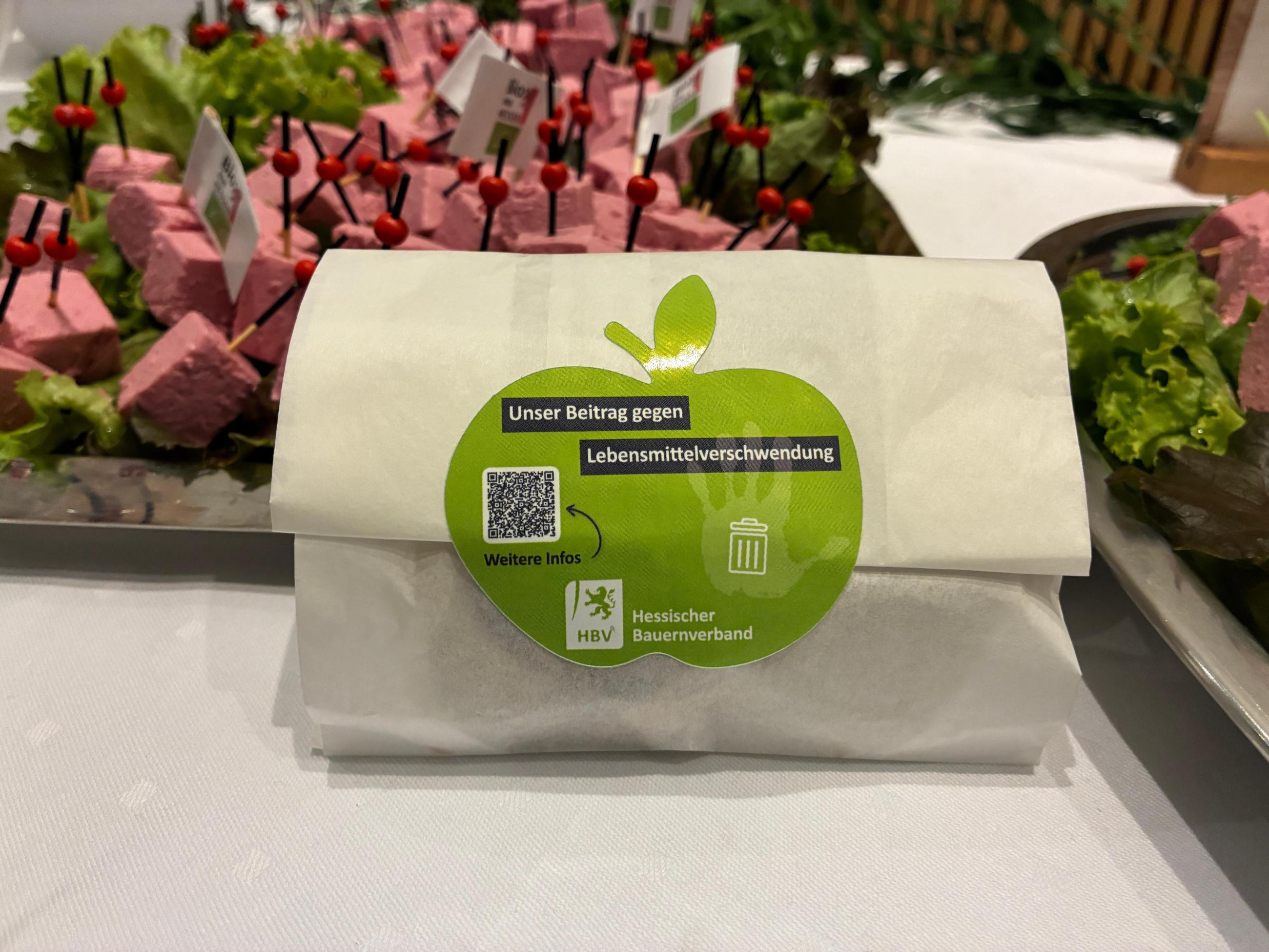 Auch bei Veranstaltungen des Hessischen Bauernverbandes bleiben oft Lebensmittel übrig. Um hier aktiv gegen Verschwendung vorzugehen, kennzeichnen wir überschüssige Lebensmittel mit unserem neuen Aufkleber „Unser Beitrag gegen Lebensmittelverschwendung“. Diese Lebensmittel werden den Teilnehmern zur Mitnahme angeboten, sodass sie nicht im Müll landen, sondern sinnvoll weiterverwendet werden.